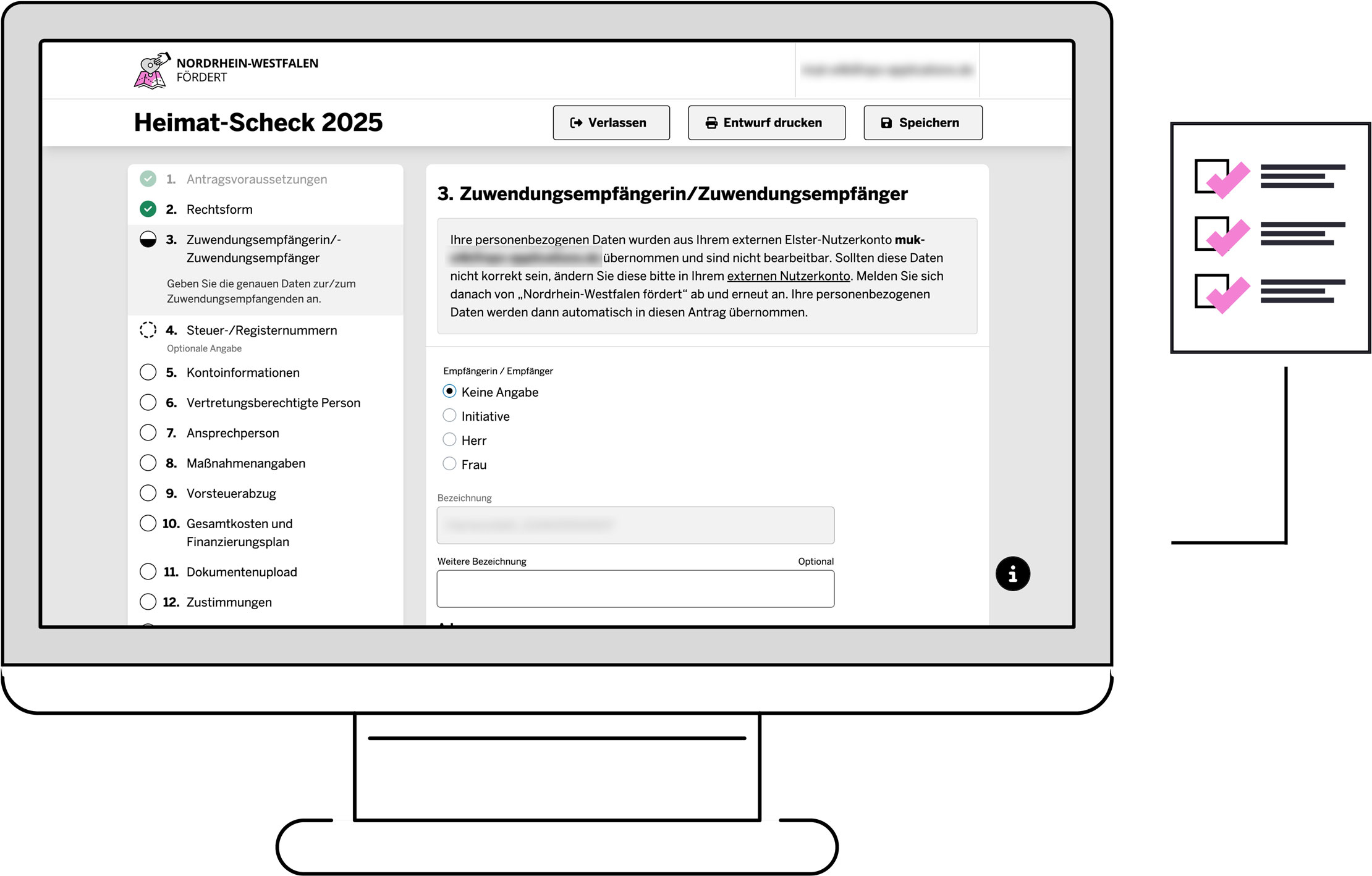 - Sie können jederzeit speichern und später fortsetzen. Ihre gespeicherten Anträge finden Sie im Bereich „Ihre aktiven Anträge“.