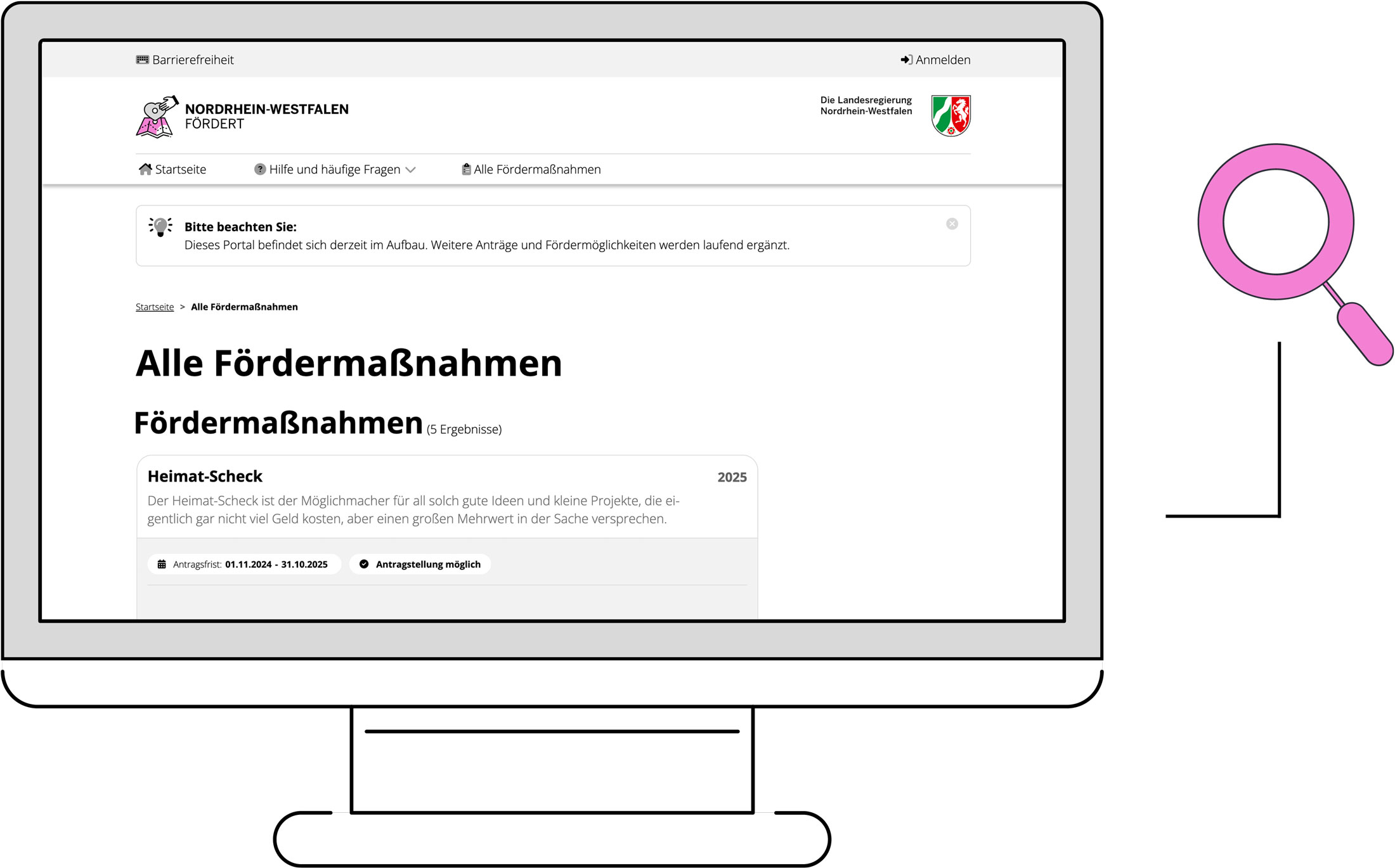 Um den richtigen Antrag für Ihr Vorhaben zu finden, nutzen Sie unsere Übersicht „Alle Förderungen“. Sie können Förderprogramme nach Stichworten durchsuchen oder mit Filtern gezielt eingrenzen. Auf den Detailseiten erhalten Sie alle wichtigen Informationen zum Antrag und können umgehend in die Antragstellung einsteigen.