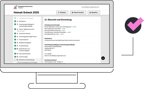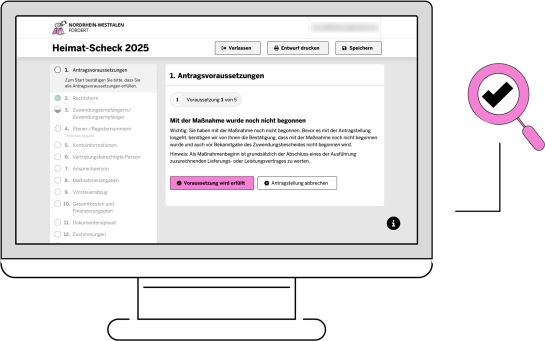 In vielen Anträgen müssen Sie im ersten Schritt bestätigen, dass Sie die Voraussetzungen für die Förderung erfüllen. Das dient dazu, fehlerhafte Anträge zu vermeiden und sicherzugehen, dass Ihr Vorhaben grundsätzlich zum ausgewählten Förderprogramm passt. Die inhaltliche Prüfung Ihres Vorhabens führt Ihre Bewilligungsbehörde durch.