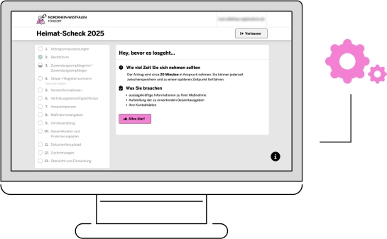 Vor dem Start geben wir Ihnen nützliche Hinweise, z. B. wie lange die Antragstellung voraussichtlich dauert und welche Dokumente Sie bereithalten sollten – so haben Sie zum richtigen Zeitpunkt alles zur Hand und können sich voll und ganz auf Ihre Angaben konzentrieren.